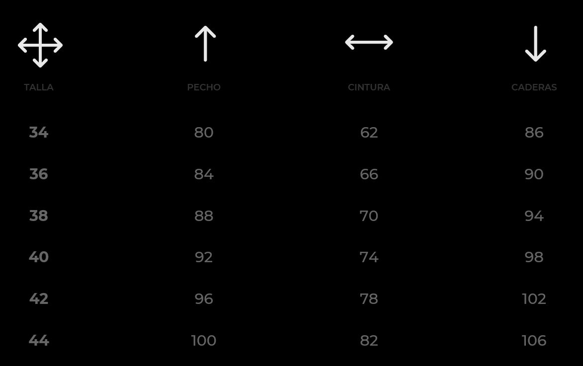 Para conocer cuál es tu talla exacta coge una cinta métrica y, sin ropa, mide tu contorno de pecho, cintura y cadera. Las medidas son orientativas. En caso de que dudes entre dos tallas y no estés segura, ponte en contacto para conocer tu talla exacta al teléfono 640609305 o mediante email a la dirección info@nazaretnieto.com