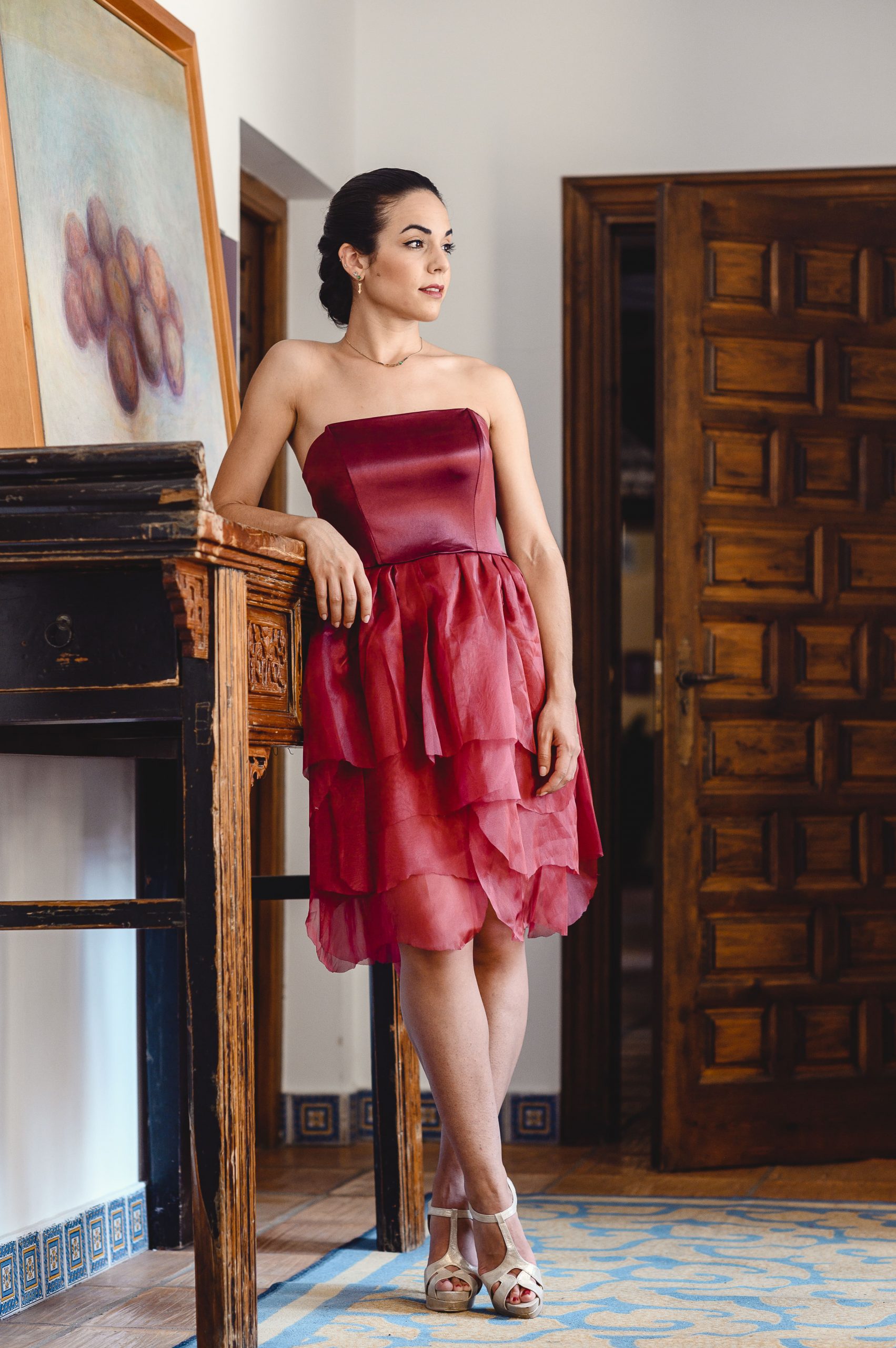 Vestido mini con cuerpo entallado, palabra de honor con detalle de cierre terminado en lazada y falda vaporosa de pétalos en diferentes tamaños realizado en organza.