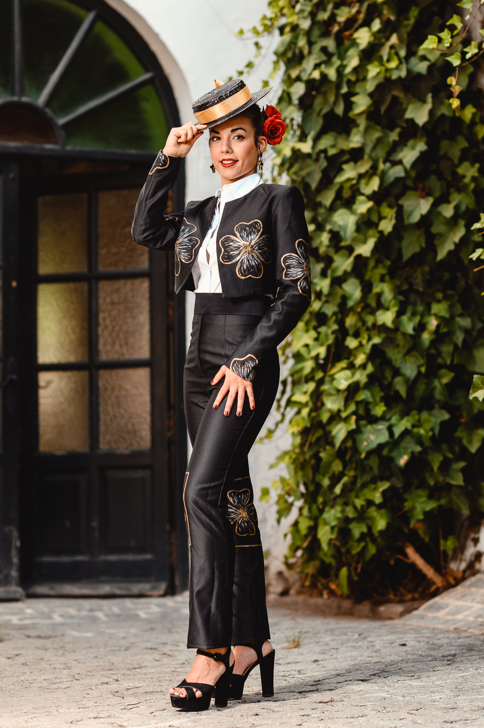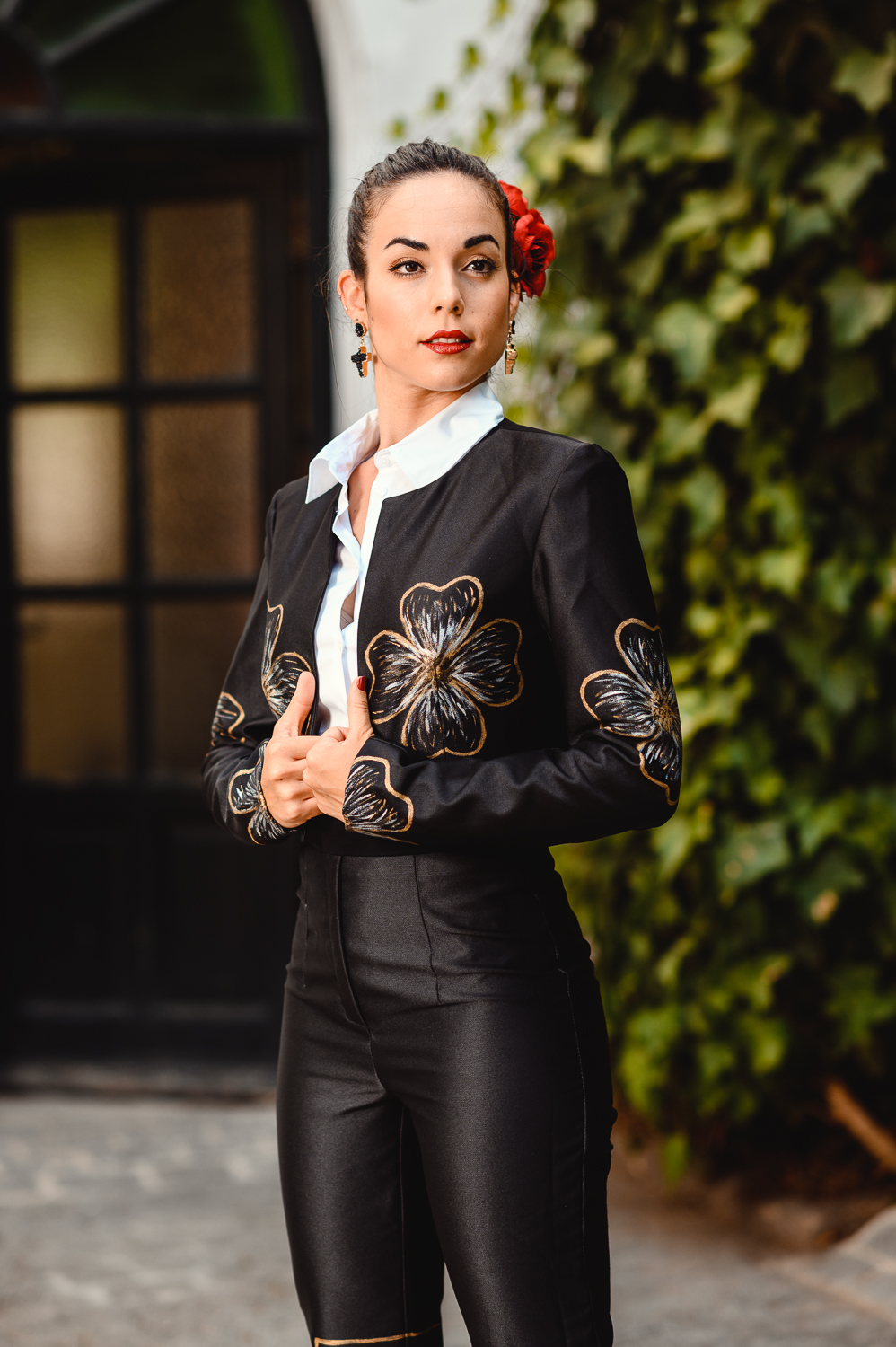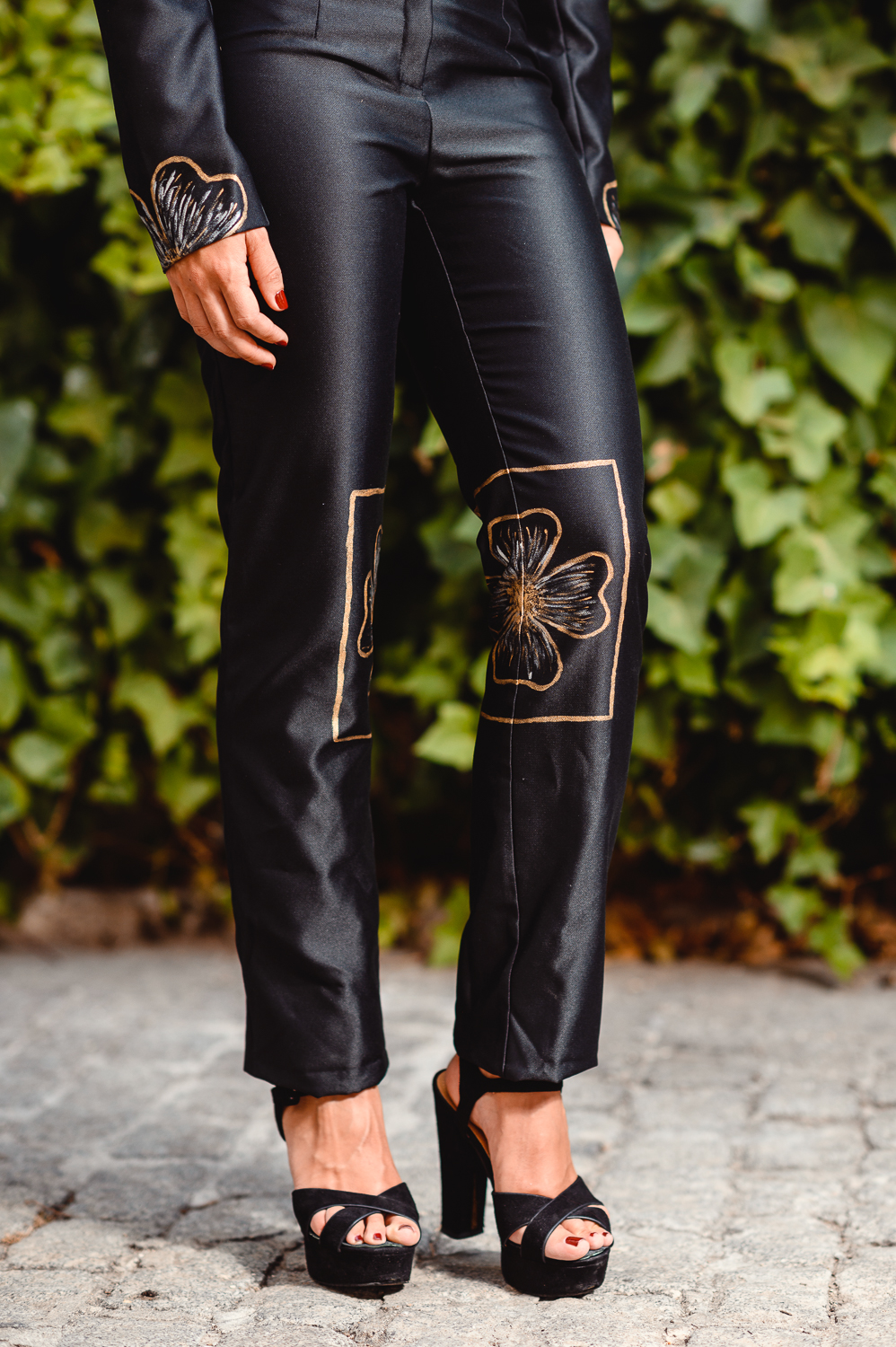 Chaqueta y pantalón confeccionado en raso negro con estampación de flores a mano.