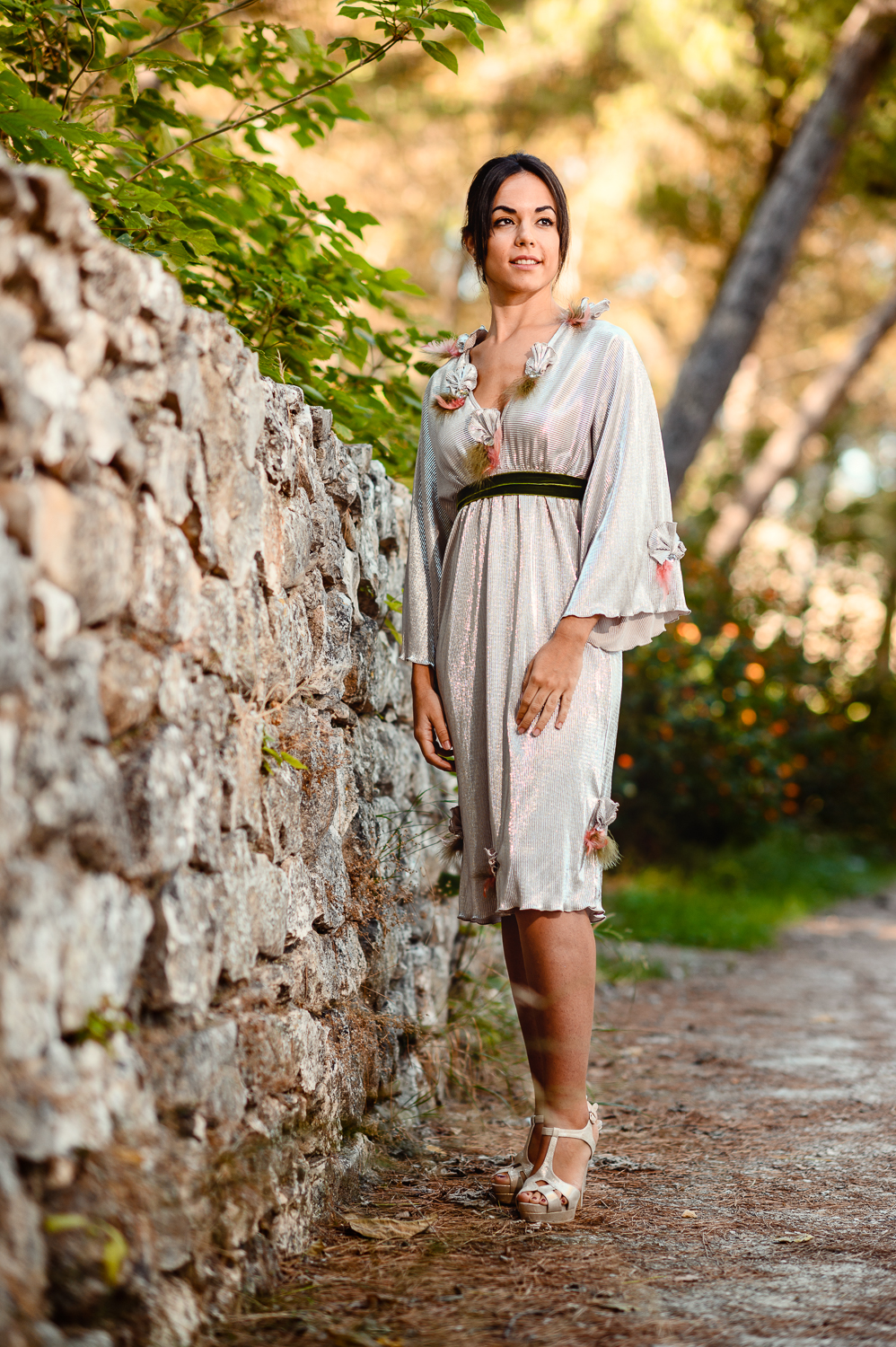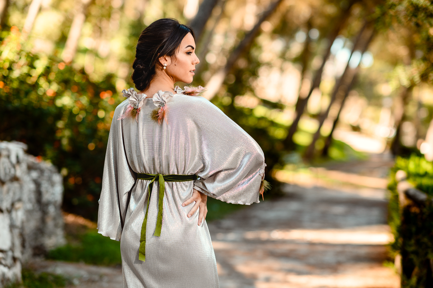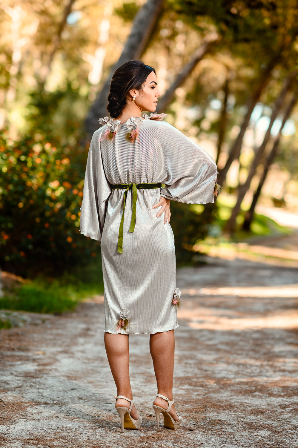 Caftán con escote de pico delantero y detalle de pedrería y plumas por el alrededor y los bajos, realizado en plisado plata.