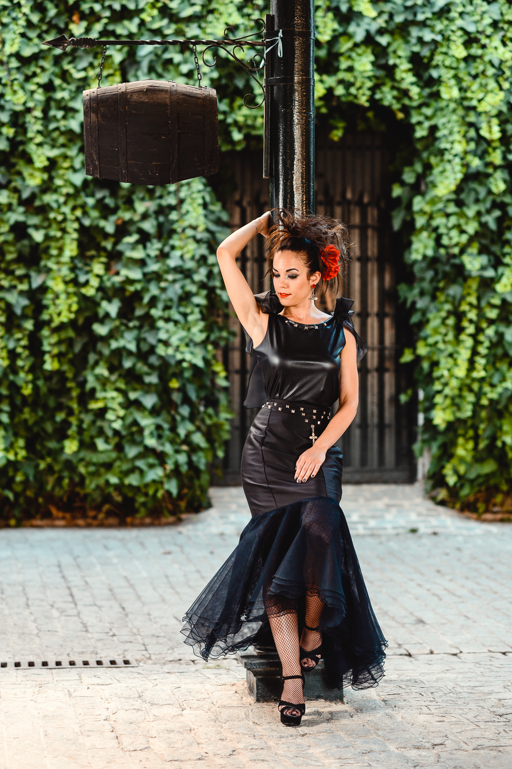 Falda realizada en mikado compuesta por tres volantes de tul y detalles de tachuelas en la cintura.
