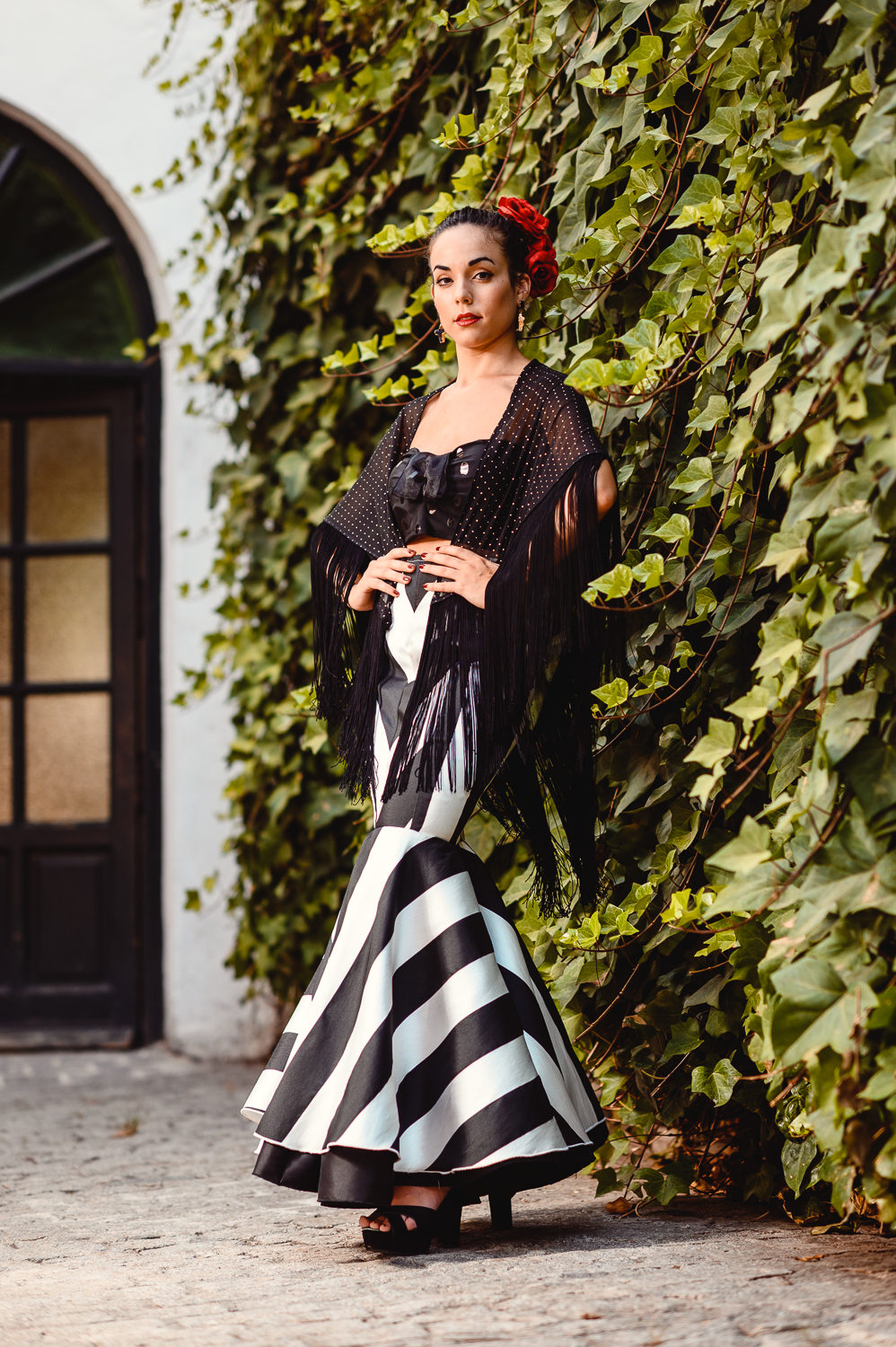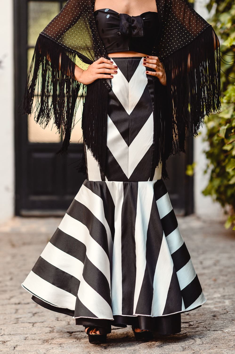 Falda confeccionada en mikado estampado de rayas blanco y negro. Top de encaje de flores negro. Mantón de gasa negra con plumeti dorado y flecos de 40cm.